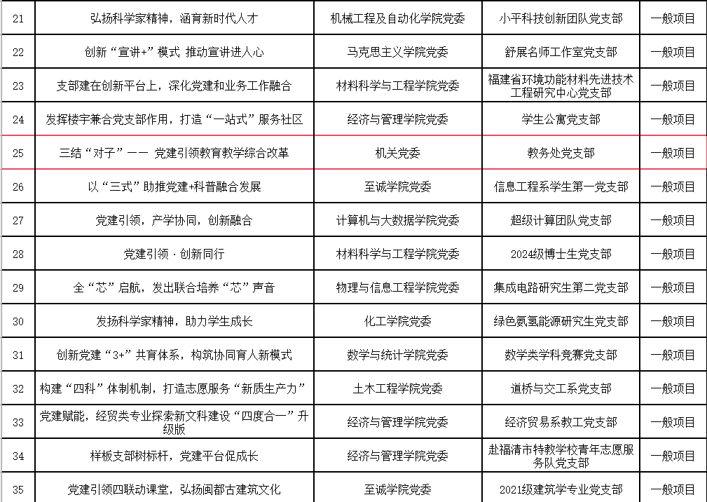 近日,学校党委公示了《福州大学2024~2026学年党支部工作“立项活动”资助项目》,教务处党支部成果《三结“对子”—— 党建引领教育教学综合改革》成功入选。全校共报送项目104项,经学校评审,拟立项校级重点资助项目20项、一般资助项目35项。