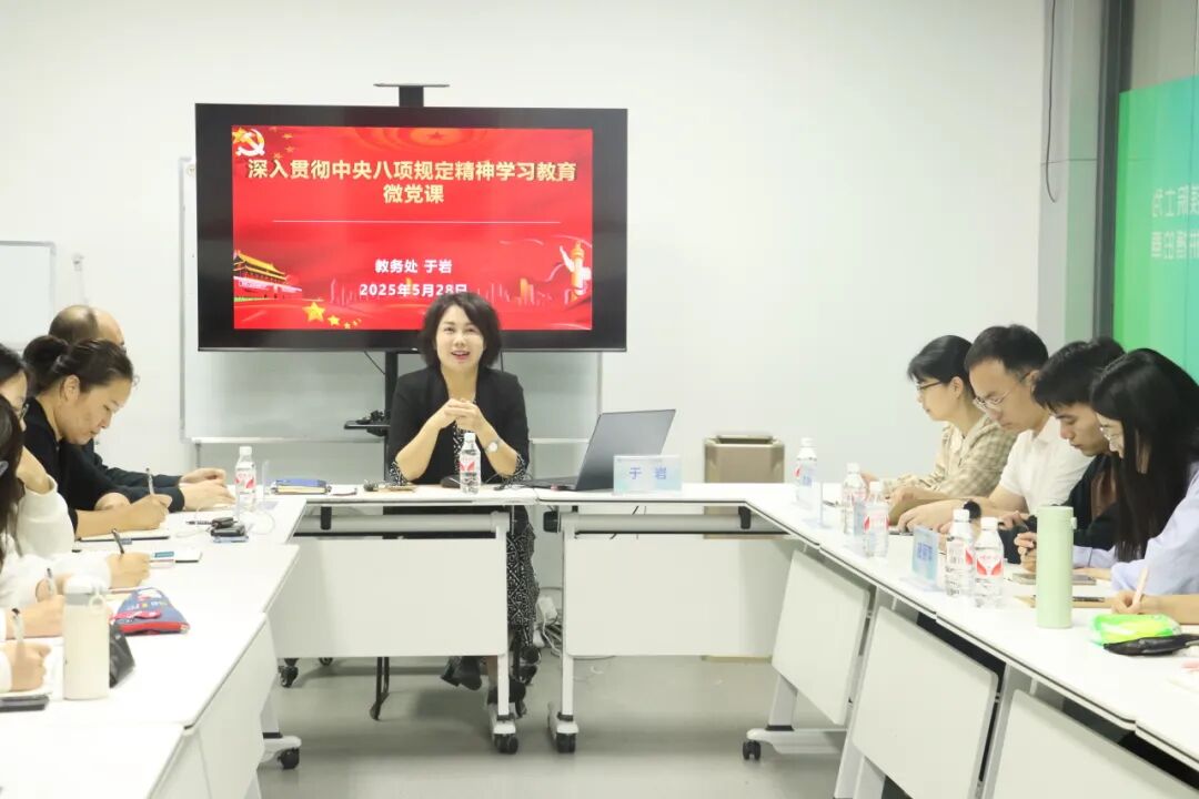 首先,福州大学教务处处长于岩老师讲授以“深入贯彻中央八项规定精神”为主题的微党课。于岩老师结合智慧教育时代背景作专题报告,系统介绍了学校在人工智能赋能教育教学领域的创新举措,并指出学校将中央八项规定精神融入师德师风建设,要求教师爱岗敬业、作风严谨。