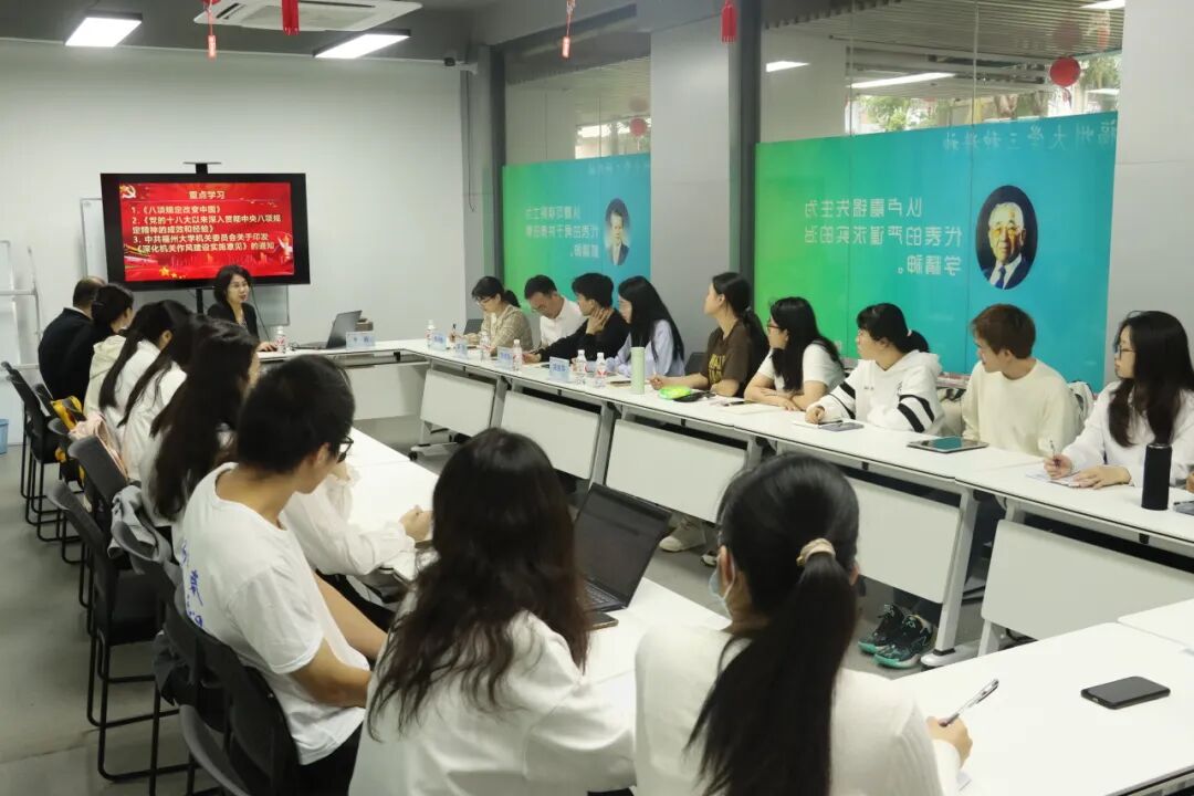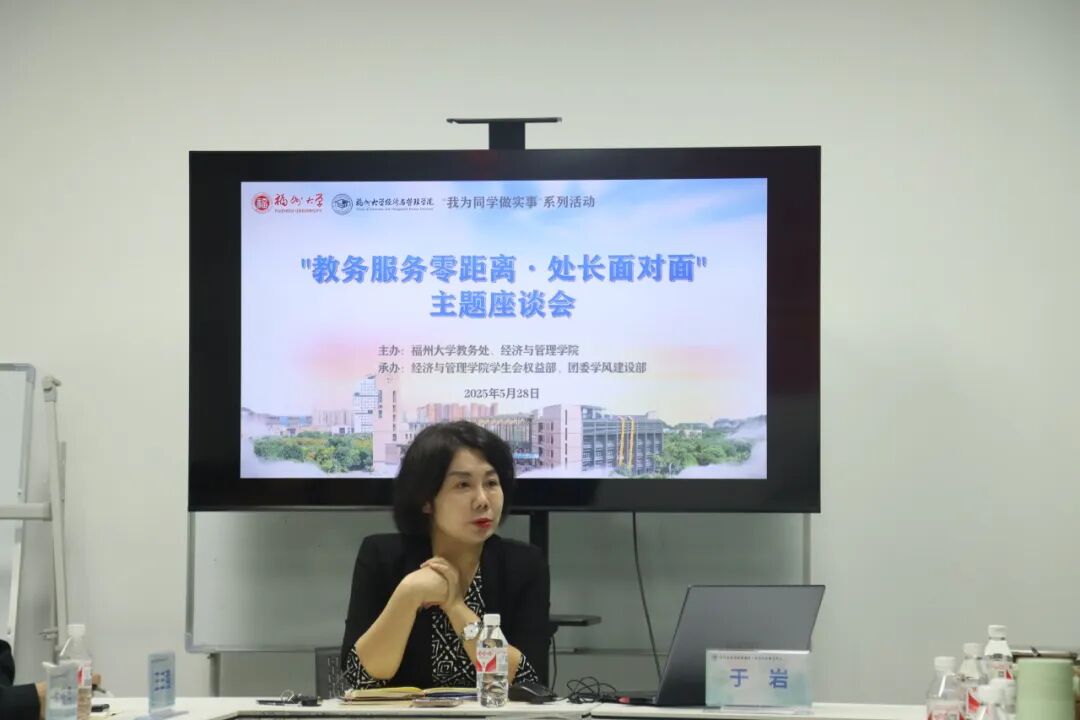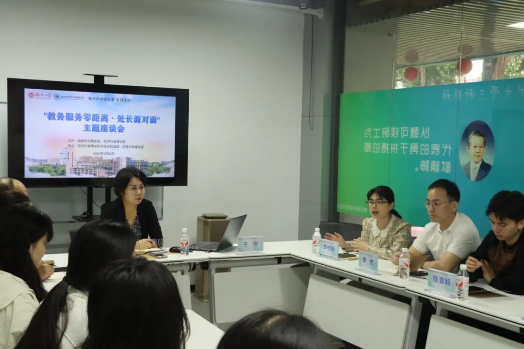 5月28日上午,福州大学经济与管理学院深入贯彻中央八项规定精神学习教育微党课暨“我为同学做实事”系列活动之“教务服务零距离·处长面对面”主题座谈会在39号楼“一站式”学生社区思政智库研讨室成功举办。教务处处长、41号楼楼宇总指导员于岩老师、教学运行科副科长李明静老师及经管学院老师出席本次座谈会,各年段辅导员及学生代表共同参与。