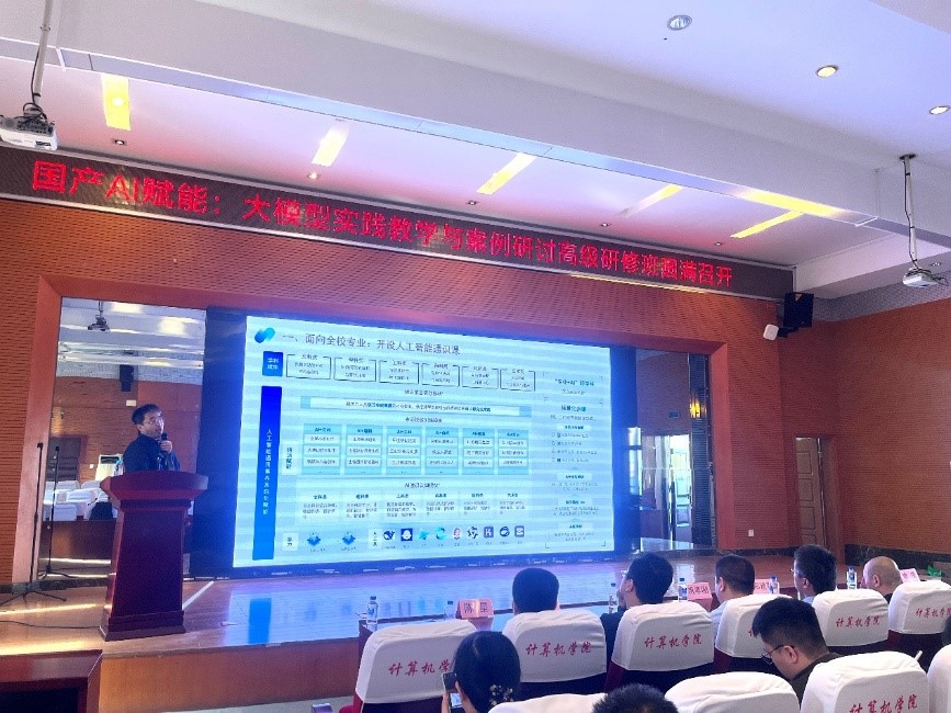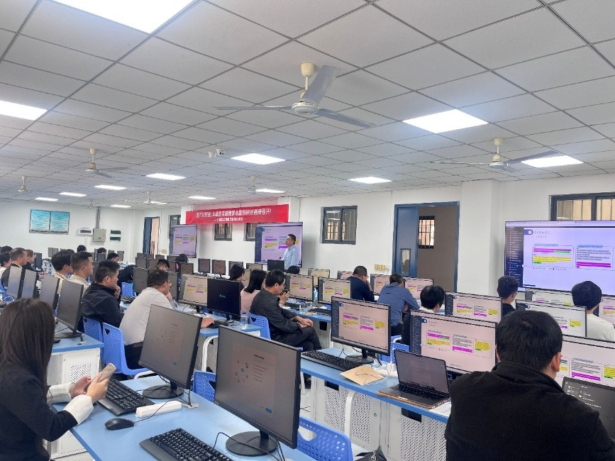 在实践教学案例研讨环节,福州大学计算机与大数据学院实验教学中心主任陈飞教授分享了“师生机协同”教学新范式的实践经验,从课程设计、课堂实施到效果评估,系统拆解了大模型赋能实践教学改革的可复制路径与实操方法。参训教师围绕“大模型融入实验教学”、“人机协同教学设计”等方向,结合教学场景,深入探讨了如何让大模型成为课堂协作者、如何通过场景化提升学生AI能力等关键问题。