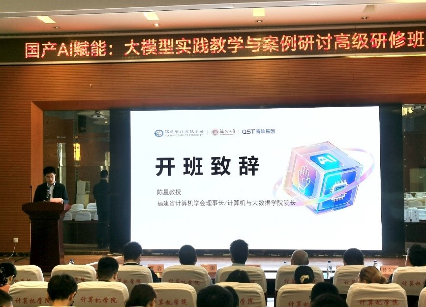 开班仪式上,福州大学教务处副处长夏岩教授点明了研修班的价值所在,期待通过资源共享助力参训教师提升将大模型技术转化为教学能力的水平。