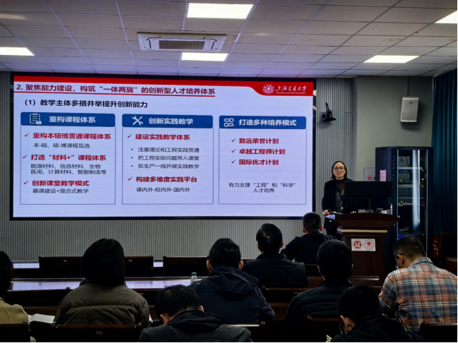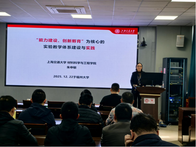 为深入推动我校实验实践教学改革,探索新工科背景下以能力培养和创新孵育为核心的教学新模式,2025年12月22日上午,由教务处主办、材料学院承办的第七十七场“教学有道”研讨活动在材料楼404会议室顺利举行。本次活动特邀上海交通大学材料科学与工程学院教授、博士生导师朱申敏担任主讲,作题为“以‘能力建设、创新孵育’为核心的实验实践教学体系的构建”的专题报告。活动吸引了来自各学院的教师、实验技术人员及教学管理人员参与研讨。报告会由材料学院分管教学副院长林枞教授主持。