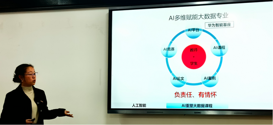 吴伶老师结合“大数据”课程改革实践,系统阐述了 AI 时代背景下课程转型的思考与探索。她在教学实践中,通过引入华为智能基座等产教融合平台,引导学生以真实应用问题为导向,综合运用大模型、多模态技术解决实际场景问题,形成具体作品,达到良好的教学成效。随后,她向大家现场展示了学生完成的“景录诗”“文物会说话”“美食配搭”等创新项目。