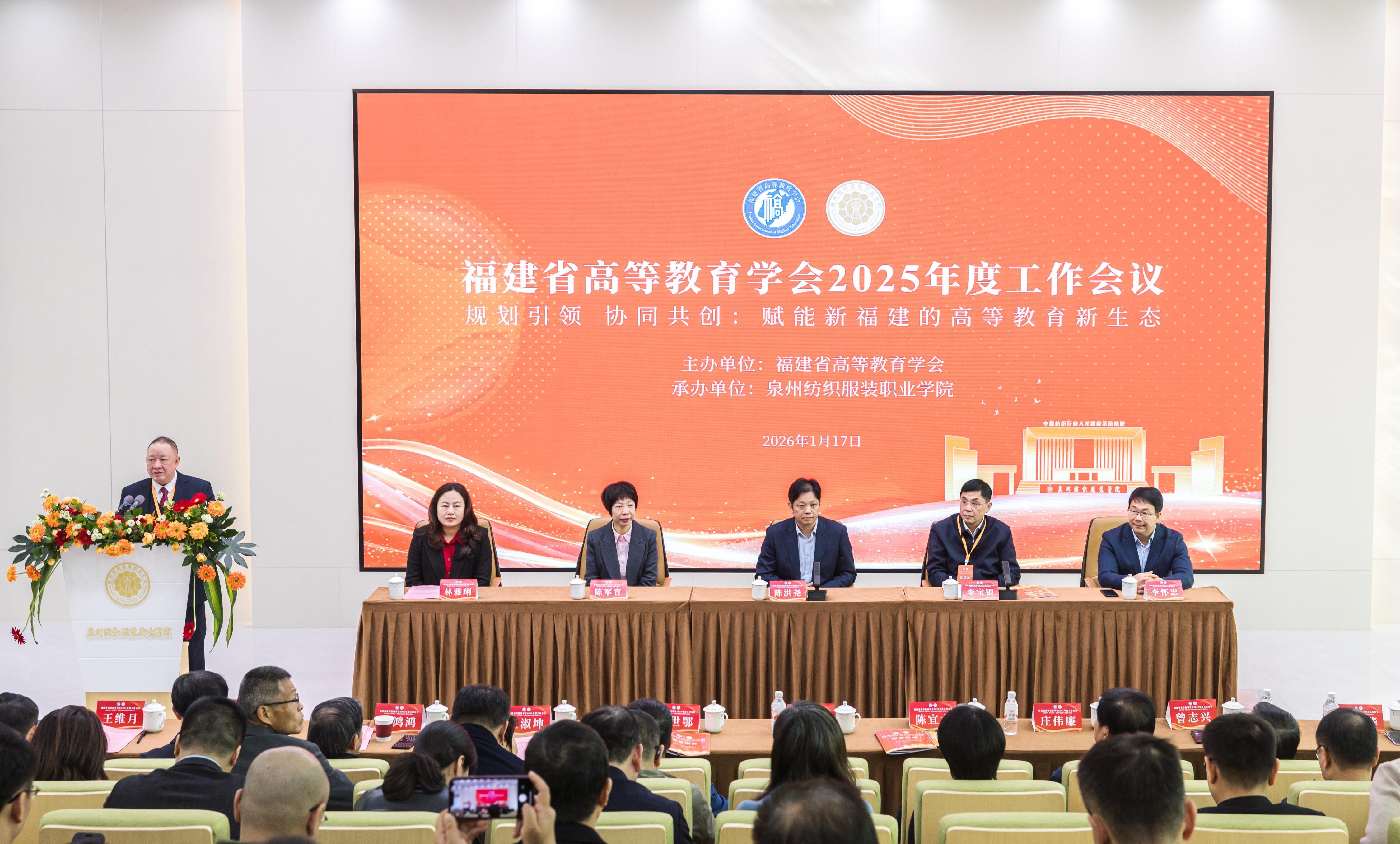 1月17日,福建省高等教育学会2025年度工作会议在泉州纺织服装职业学院召开。省委教育工委副书记、省教育厅党组成员、副厅长陈洪尧,省高等教育学会会长李宝银,学会第八届理事会、监事会领导机构成员,学会常务理事、理事、各分支机构负责同志参加了会议。