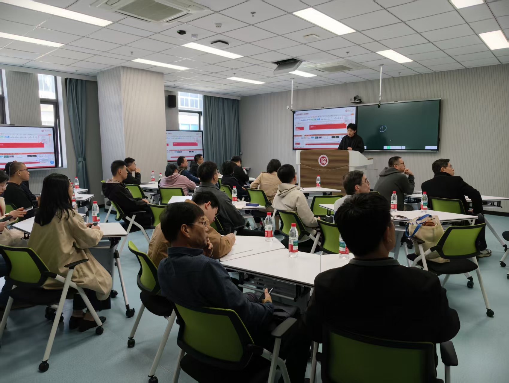 本期培训重点针对研讨型智慧教室、录播型智慧教室的设备使用、福大课程未来学习中心平台的登录操作、课程平台基础功能以及AI赋能教学应用等方面展开。培训内容涵盖了教室上下课设备开关、交互屏使用、无线麦操作、录播系统应用、分组研讨及学生投屏功能、课程资源平台教师端与学生端操作、课程资源应用等方面。培训还结合实际教学场景进行演示,帮助教师现场掌握本地课堂操作、研讨功能应用以及如何借助平台实现课堂教学资源整合与智能化教学创新。